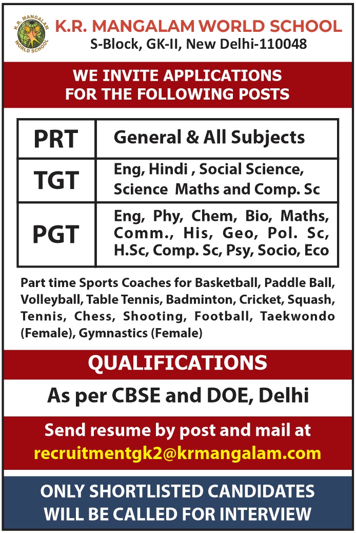 Desirable : Minimum 3 years experience for PRT/TGT posts & 5 years experience for PGT posts. Application forms may be obtained from the School premises between 9am to 2pm on all working days or can be downloaded from the school website of the concerned Institution. Completed applications should reach the concerned school by POST latest within 7 days of advertisement or be mailed at recruitmentgk2@krmangalam.com Candidate may also submit the filled up forms at the school gate.
