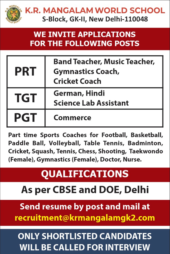 Desirable : Minimum 3 years experience for PRT/TGT posts & 5 years experience for PGT posts. Application forms may be obtained from the School premises between 9am to 2pm on all working days or can be downloaded from the school website of the concerned Institution. Completed applications should reach the concerned school by POST latest within 7 days of advertisement or be mailed at recruitment@krmangalamgk2.com Candidate may also submit the filled up forms at the school gate.